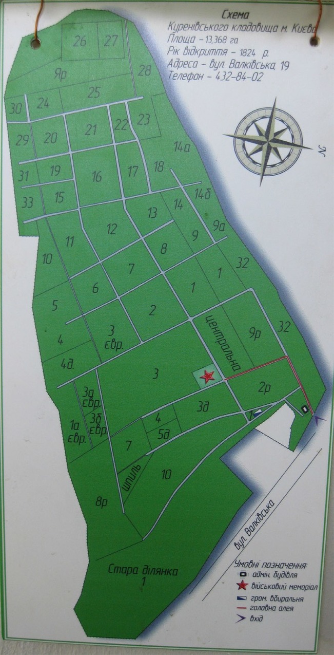Вхід на територію Куренівського кладовища здійснюється через головну браму, розташовану за адресою: вул. Валківська, 19.